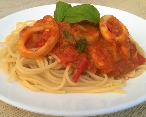 - Sautee calamari until cooked, usually just a couple minutes. Then add sauce back into the pan. Mix well..